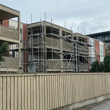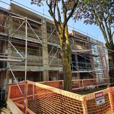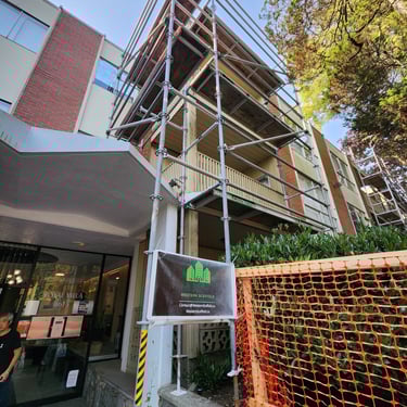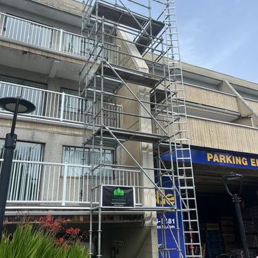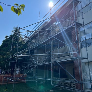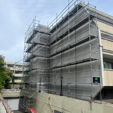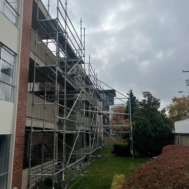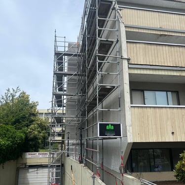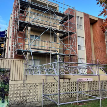 We are proud to support the balcony renovation project on this multi-story residential building. Western Scaffold has designed and installed a comprehensive scaffolding system that fully envelops the structure, providing safe and efficient access to all balcony levels. Our setup includes secure ladder access, protective overhead walkways, and a low-clearance entry to accommodate vehicle access beneath. This enables the renovation team to perform exterior repairs, resurfacing, and safety upgrades without disruption. With autumn in full swing, our durable scaffolding ensures work continues smoothly and safely through the season. Building up, one level at a time.